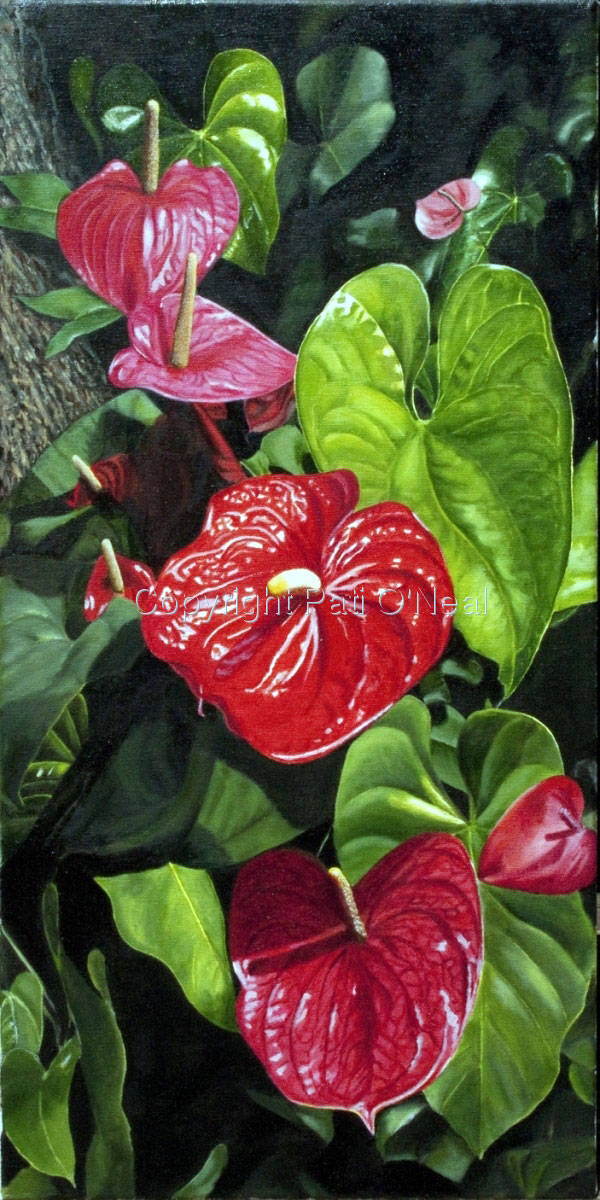 Limited edition giclee from an original oil painting by Pati O’Neal of red anthurium flowers.