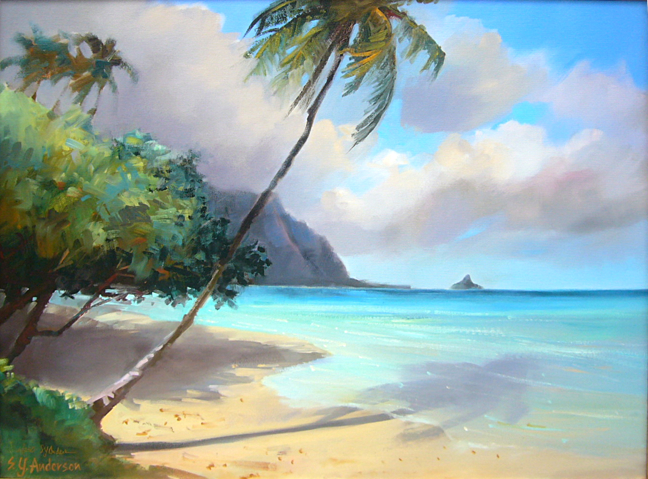 A seaside view of Kaneohe Bay and Chinaman’s Hat island in the distance.