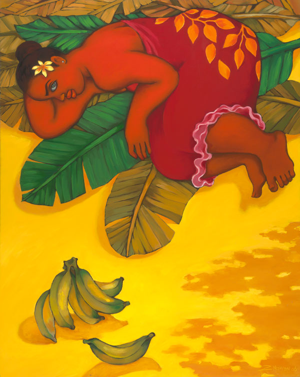 Giclee reproduction of an original oil painting of woman, banana leaves and bananas by artist Tim Nguyen