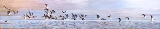Giclee reproduction on canvas of a painting of birds taking off from water by artist Joelle Chicheportiche.