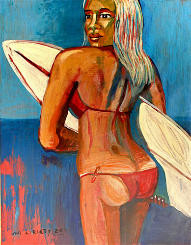 An original oil painting on paper of a woman with her surfboard, by the water’s edge in a red bikini, by artist, Avi Kiriaty. Size is 30.5″ x 46.5″. Artwork ships boxed and insured.