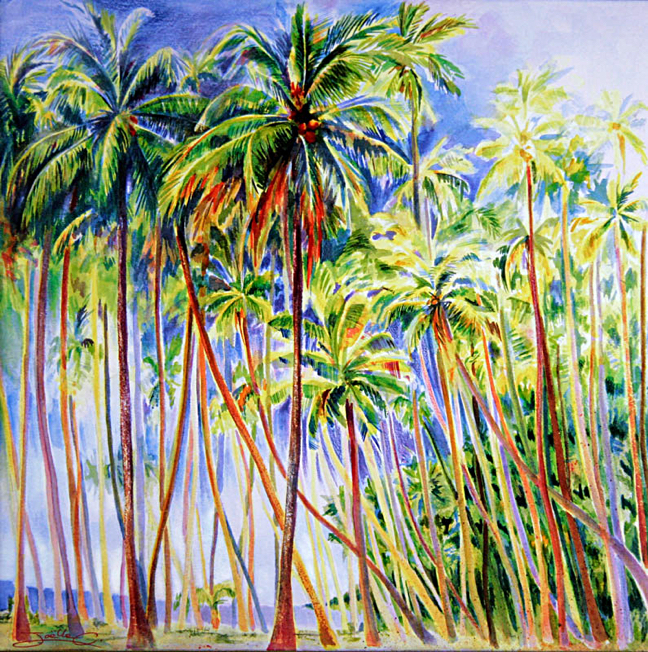 Matted giclee on paper of painting of palm trees by artist Joelle Chicheportiche. Size includes mat. Mat color is white.