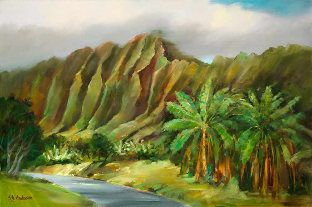Giclee reproduction on canvas from an original oil painting of the Koolau Mountain range from Hoomaluhia Gardens on the island of Oahu by artist Susie Y. Anderson.
