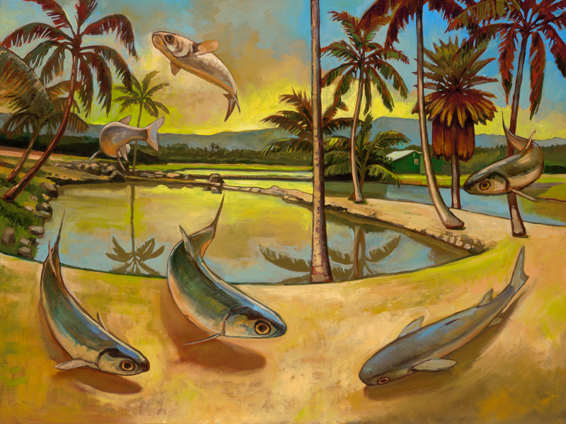 Giclee on canvas of an original oil painting of fish at the Haleiwa fish pond on the north shore of Oahu by artist Colin Redican.