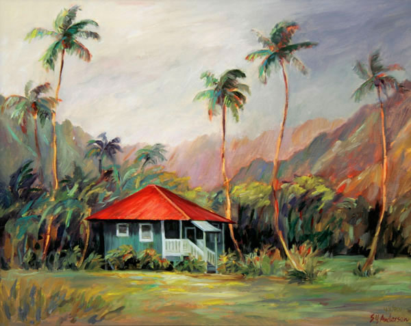 Giclee reproduction from an original painting of house and palm trees by artist Susie Y. Anderson.