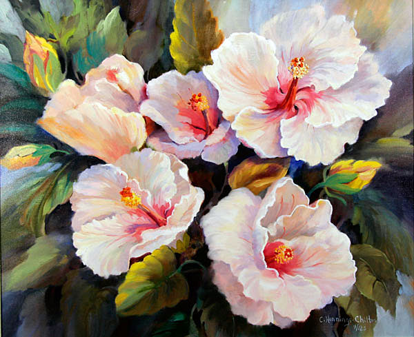 A hand-enhanced, limited edition, giclee reproduction from an original oil painting of hibiscus flowers by artist Connie Hennings-Chilton.