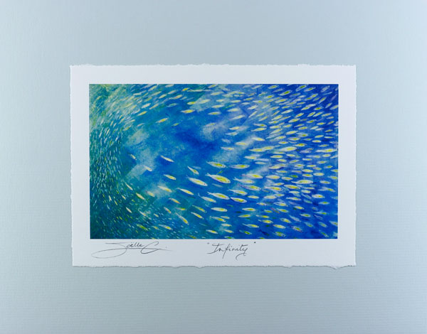 Print mounted on mat board of a school of fish by artist Joelle Chicheportiche.