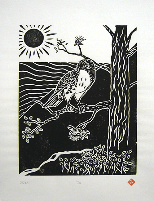 Black and white image of a rare native Hawaiian hawk called an ‘Io. The artist uses graphic lines chiseled into artist’s linoleum to depict his dramatic Hawaii themed images