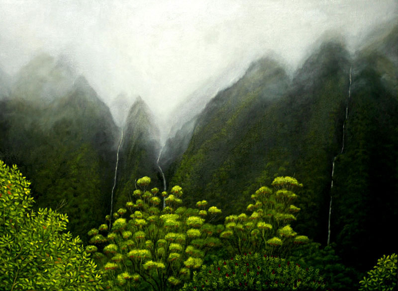 Giclee reproduction of an original oil painting of mountains with waterfalls by artist Patti O’Neal.