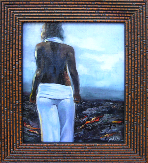 An original oil painting by Rose Adare. A glow from the active lava illuminates this visitor.