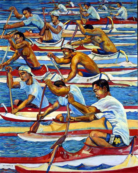 Giclee of painting of canoe race by artist Avi Kiriaty