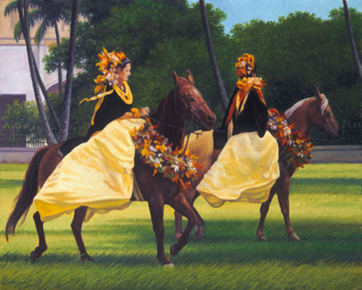 Giclee reproduction on canvas of an original oil painting by the artist Gary Reed in a limited edition of 100. The painted scene is of riders in preparation for the King Kamehameha Day parade on the island of Oahu, Hawaii. Size: 16″ x 20″. Artwork ships unframed and rolled in a tube.