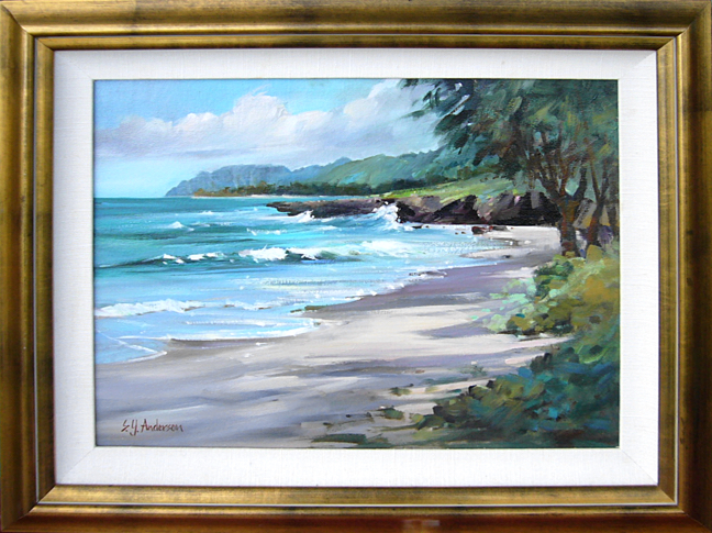 Susie Anderson’s original oil painting of Pounders beach on the windward side of Oahu.