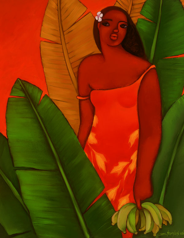 A matted print of painting of woman picking bananas by artist Tim Nguyen. Size includes mat. Mat color is white.