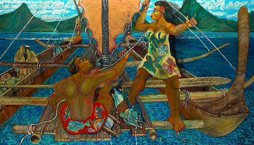 Giclee reproduction, from an original oil painting, showing a couple sailing an outrigger canoe, by artist Avi Kiriaty
