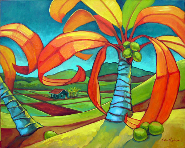 Giclee reproduction on canvas from an original oil painting showing colorful palm trees and country cottage, by artist Colin Redican.