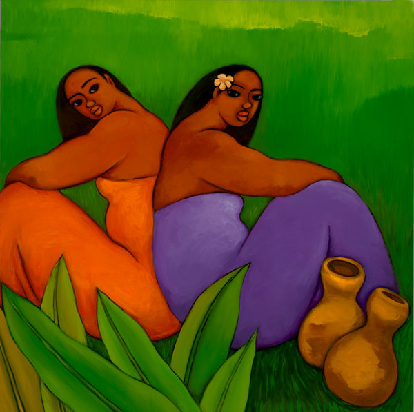 A matted print of an original painting of two seated woman by artist Tim Nguyen. Size includes mat. Mat color is white.