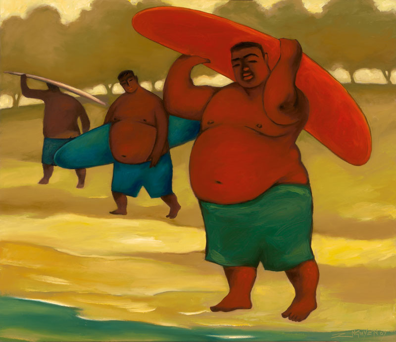 Giclee reproduction on canvas of an original oil painting of three men with surfboards by artist Tim Nguyen
