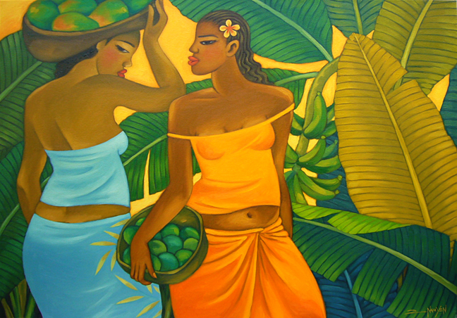 Two young women, in a lush tropical setting, on their way to the market with their goods