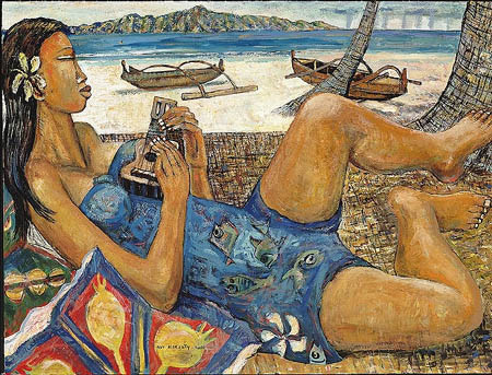 Giclee of painting of woman playing ukulele by artist Avi Kiriaty