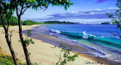 Giclee reproduction on canvas from an original oil painting of Waimanalo beach on the windward side of Oahu, by artist Patrick Ching.