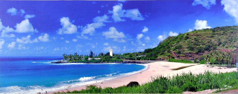 Giclee on canvas of photograph of Waimea Bay by artist Estelle V. Jeong.