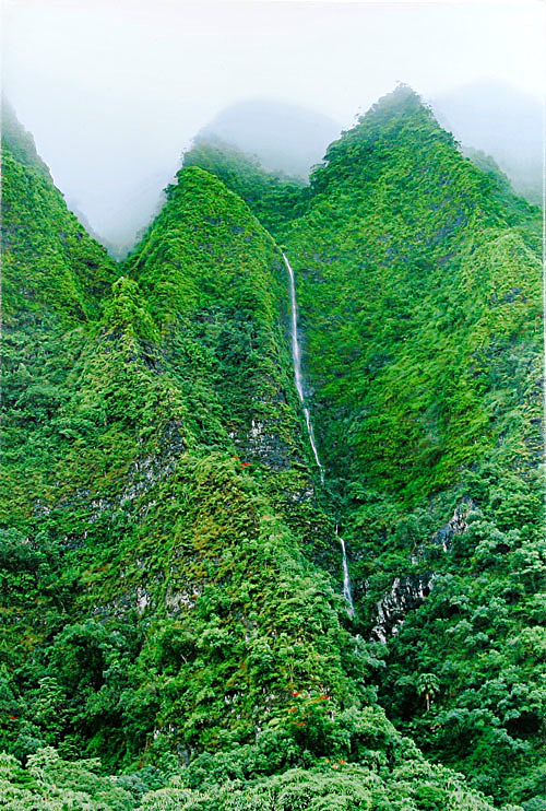 A giclee on canvas from a photograph of rain-driven waterfalls along the Ko’olau Mountain range by artist Estelle V. Jeong. This stretch of mountains is seen from Hoomaluhia Gardens in Kaneohe.