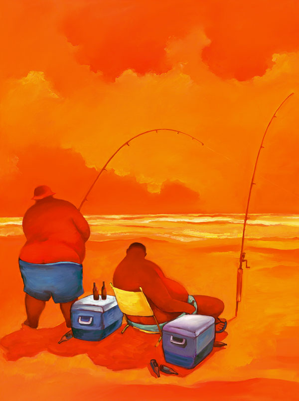 A matted print of an original painting of two man fishing by artist Tim Nguyen. Size includes mat. Mat color is white.